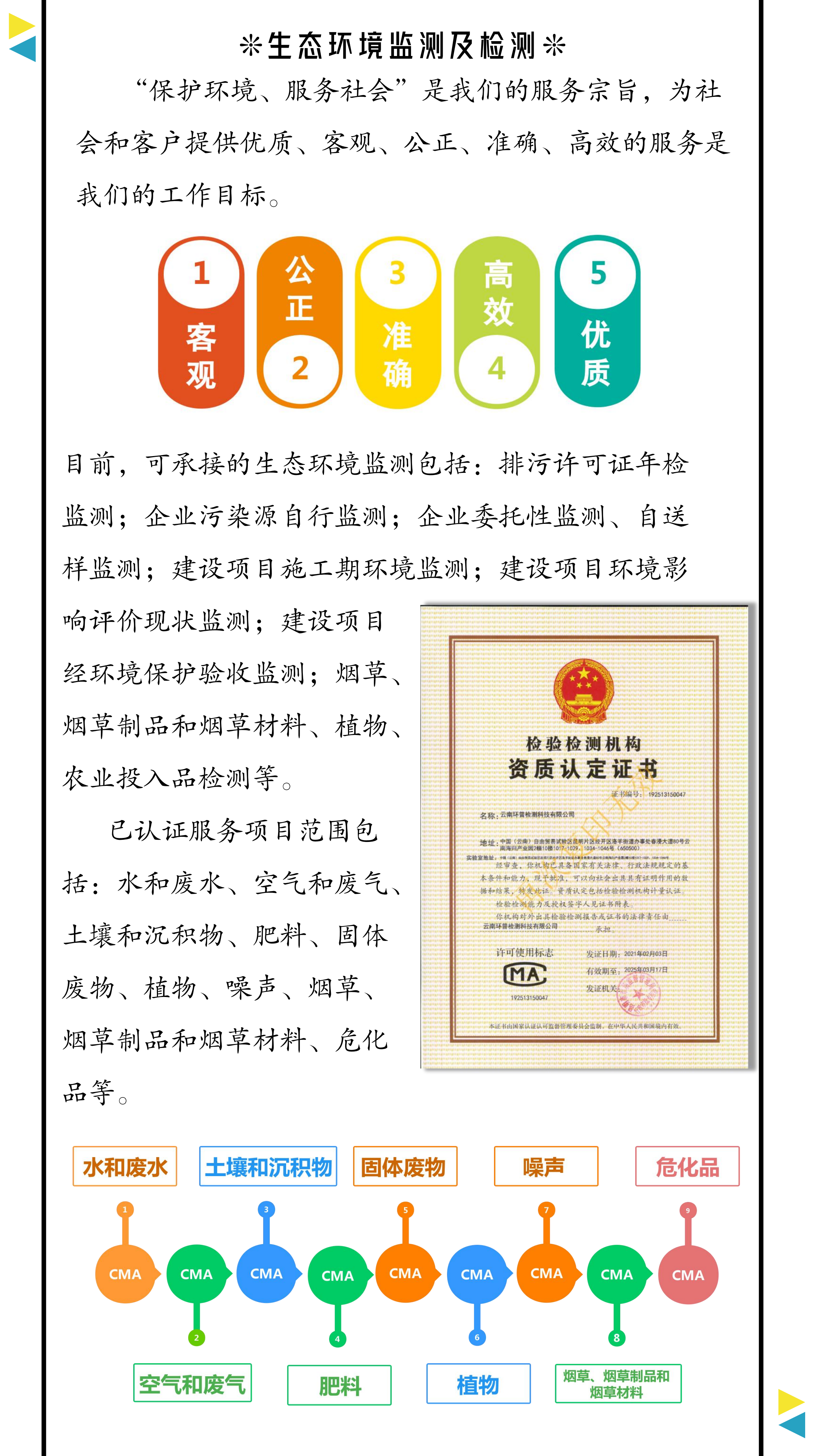 檢測范圍包括:排污許可證年檢監(jiān)測;企業(yè)污染源自行監(jiān)測;企業(yè)委托性監(jiān)測、自送樣監(jiān)測;建設項目施工期環(huán)境監(jiān)測;建設項目環(huán)境影響評價現(xiàn)狀監(jiān)測;建設項目經環(huán)境保護驗收監(jiān)測;煙草、煙草制品和煙草材料、植物、農業(yè)投入品檢測等